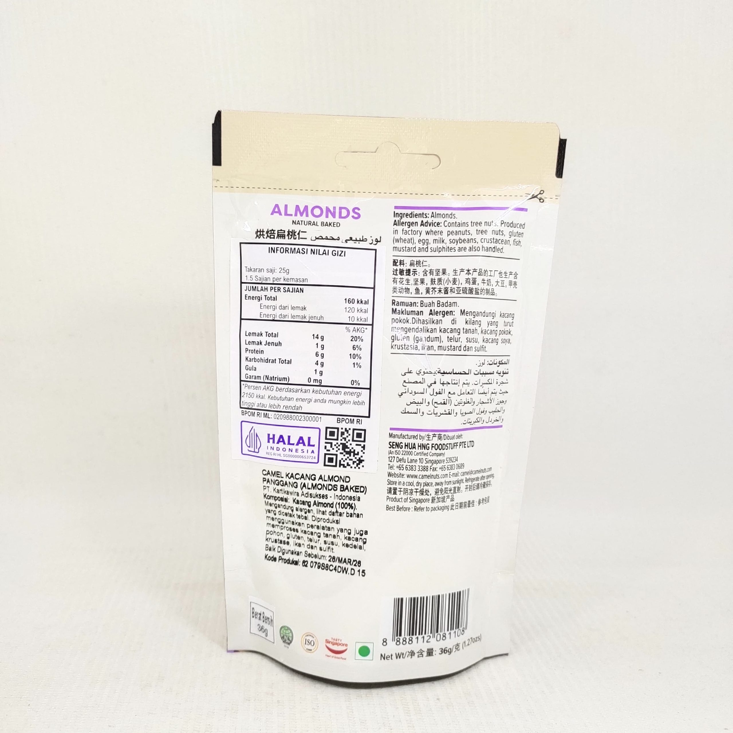 Nikmati kelembutan dan kerenyahan dari CAMEL Roasted Almond dalam kemasan mini 36 g. Almond panggang yang diproses dengan teknik khusus untuk mempertahankan aroma alami dan tekstur renyah. Cocok untuk camilan praktis kapan saja—saat bekerja, berkendara, atau bersantai.