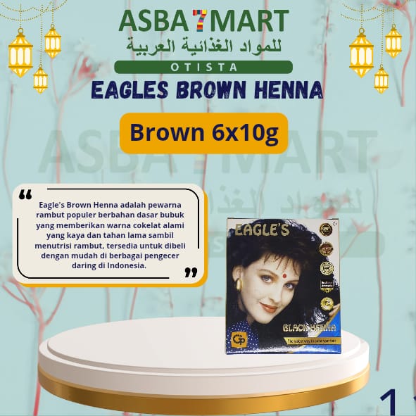 EAGLES BROWN HENNA 1 BOX ISI 6 X 10G adalah paket praktis berisi 6 kemasan henna cokelat alami, masing-masing seberat 10 gram. Diformulasikan dengan bahan henna berkualitas tinggi, produk ini memberikan warna cokelat yang kaya dan tahan lama pada rambut Anda, sekaligus memberikan perawatan alami untuk rambut yang lebih sehat. EAGLES BROWN HENNA bebas dari bahan kimia berbahaya, sehingga aman untuk digunakan pada rambut dan kulit kepala. Setiap kemasan cukup untuk satu aplikasi, menjadikannya pilihan ekonomis dan efektif untuk merawat rambut Anda.