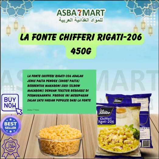 La Fonte Chiferi Rigati no 206 Pasta [500 g] merupakan pasta sehat yang mudah disajikan, tanpa bahan pewarna dan bahan pengawet. Memiliki kandungan protein dan serat yang tinggi, tidak mudah hancur saat dipanaskan maupun dimasak. Cocok untuk keluarga Indonesia.