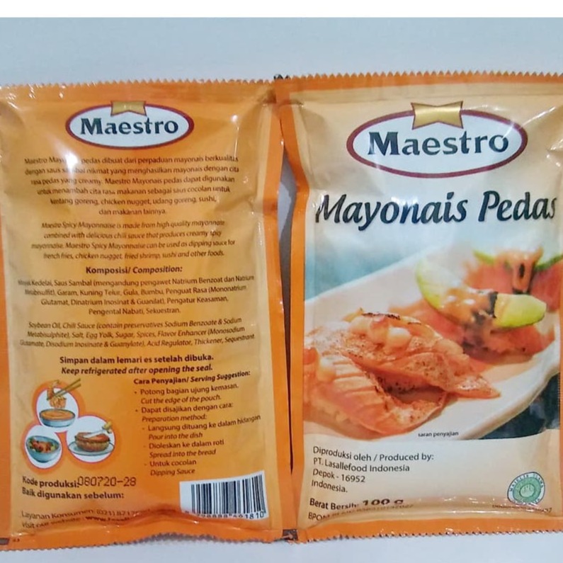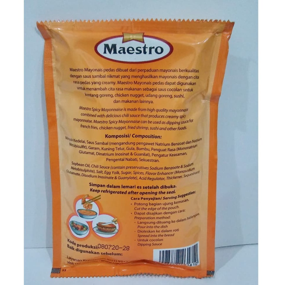 Maestro mayonaise merupakan perpaduan mayonais dengan saus sambal nikmat yang menghasilkan mayonais dengan cita rasa pedas yang creamy. Maestro mayonaise dapat digunakan sebagai saus untuk salad, sandwich, burger, hotdog, kebab, sebagai saus cocolan untuk kentang goreng, chicken nugget, udang goreng, sebagai campuran saus dengan menambahkan bahan-bahan lain seperti serbuk kari, saos sambal dan lainnya. Ideal untuk melengkapi kebutuhan dapur Anda.