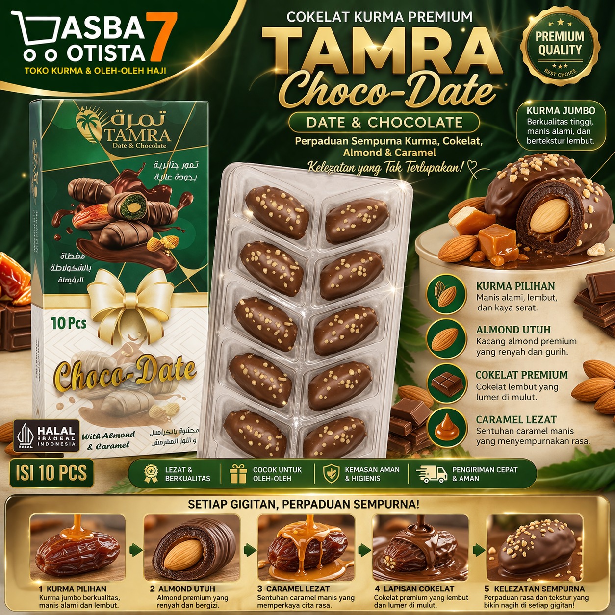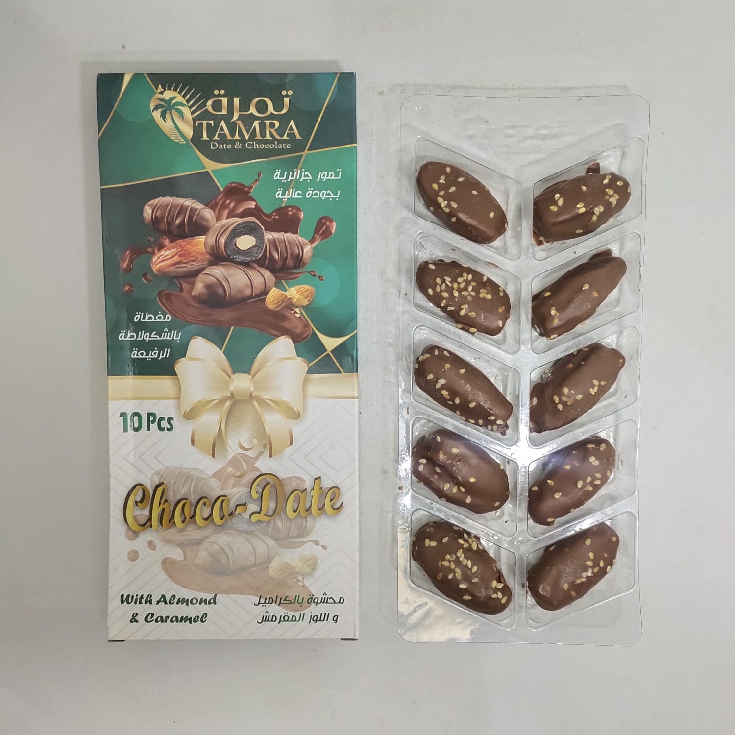 Tamra Choco with Almond dan Caramel (isi 10) adalah camilan cokelat yang memadukan rasa manis, gurih, dan sedikit renyah dalam satu gigitan. Berikut deskripsinya: